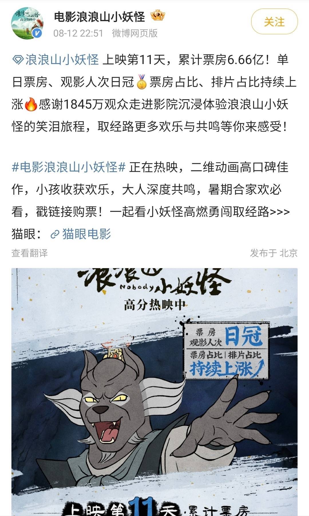 已毕8月12 日晚上,上映11天的《浪浪山小妖魔》累计票房照旧达到6.66亿!
