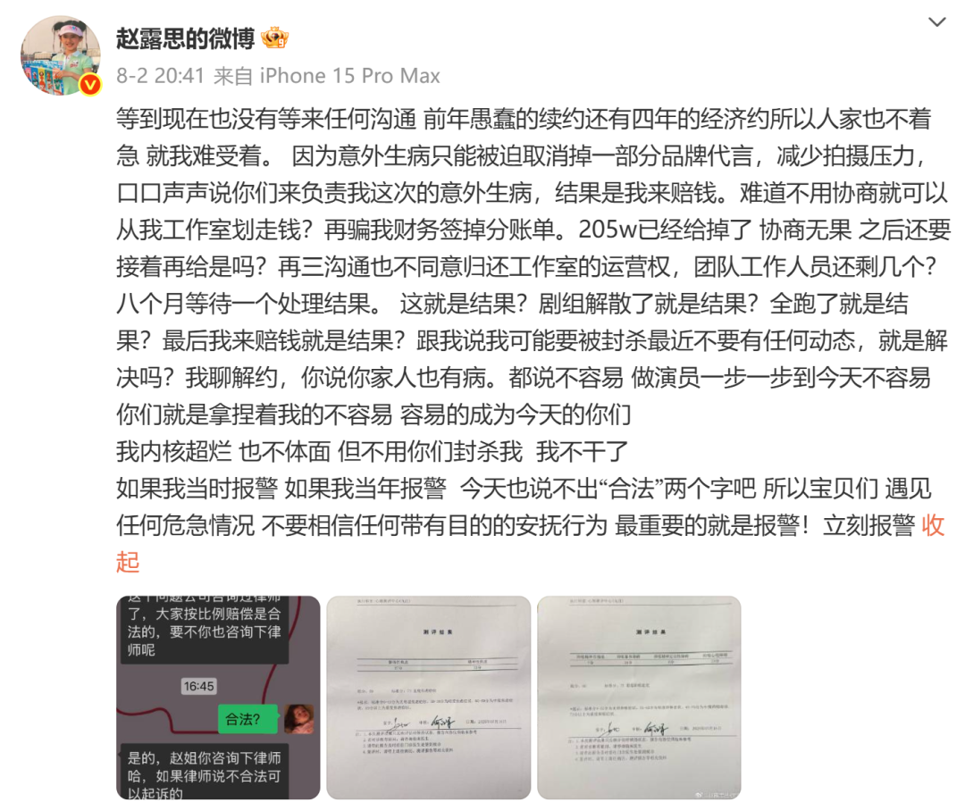 2025年1月1日,赵露念念本东说念主在个东说念主应答账号发布长文称我方患有抑郁症,并承认曾因没试上戏遭殴打一事。随后,赵露念念佛纪公司星河酷娱发文致歉,称“露念念和咱们关于使命标的并无不对,均在充分赢得共鸣的基础上力求合理安排及合作关系使命开展”,但并未正面呈报赵露念念文中提到的“殴打”“多量分袂费”等问题。