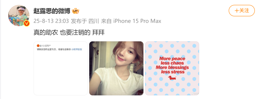 8月13日晚,演员赵露念念发微博:“确实助农,也要刊出的,拜拜。”