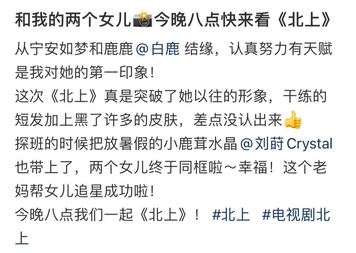 3月3日,翁虹晒出了和男儿小水晶还有白鹿的合影,蓝本翁虹在为白鹿行将播出的新剧《北上》打call,她和白鹿仍是互助过《拖沓如梦》,俩东说念主在剧中扮演一双母女,说起到对白鹿的印象,翁虹暗示白鹿是一位崇拜尽力又有天禀的演员。关于这次三东说念主同框,翁虹应许发文:“两个男儿终于同框了,很幸福。”