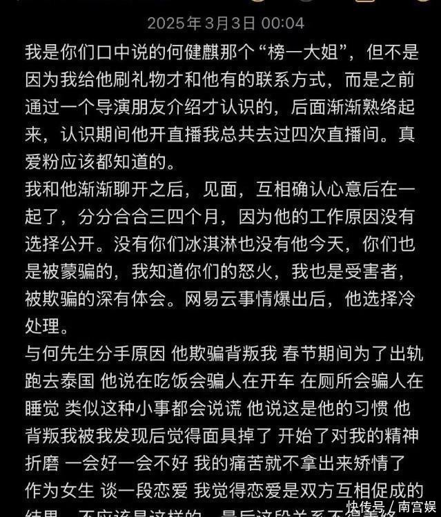 就在前一天,也即是3月3日的时候,有一个女网友在网上发布长文痛斥何健麒,存在着诸多劣迹行为。