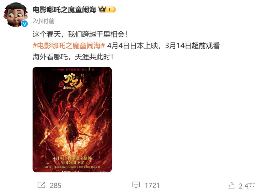 3月8日,《哪吒2》官方微博再度放出好音尘,布告将于4月4日在日本上映。