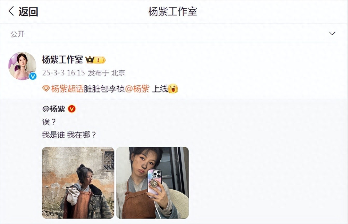 3月3日下昼,杨紫也在个东说念主的酬酢平台上共享了一组像片,并为此配文:“诶?我是谁 我在哪?”随后,杨紫使命室也转发宣传:“脏脏包李祯@杨紫 上线”,独到的造型也受到了网友们的粗鄙关心,更是因此被赞超敬业了。
