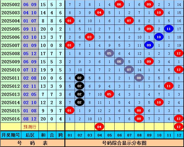 后区:上期开出奖号08+12,最近30期这两码王人出现了4次,其下期落号奇偶比为5:7,大小比为8:4,012路比为4:1:7,本期后区庄重号码04、06、07、08、12。