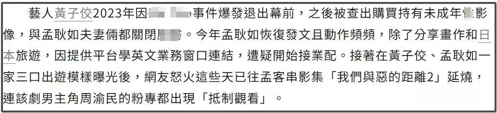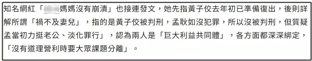 越是回忆网友越是以为盛怒,纷纷暗示不仅黄子佼不可复出,他的夫人孟耿如既然不和丈夫切割,那就随着一谈退圈吧。