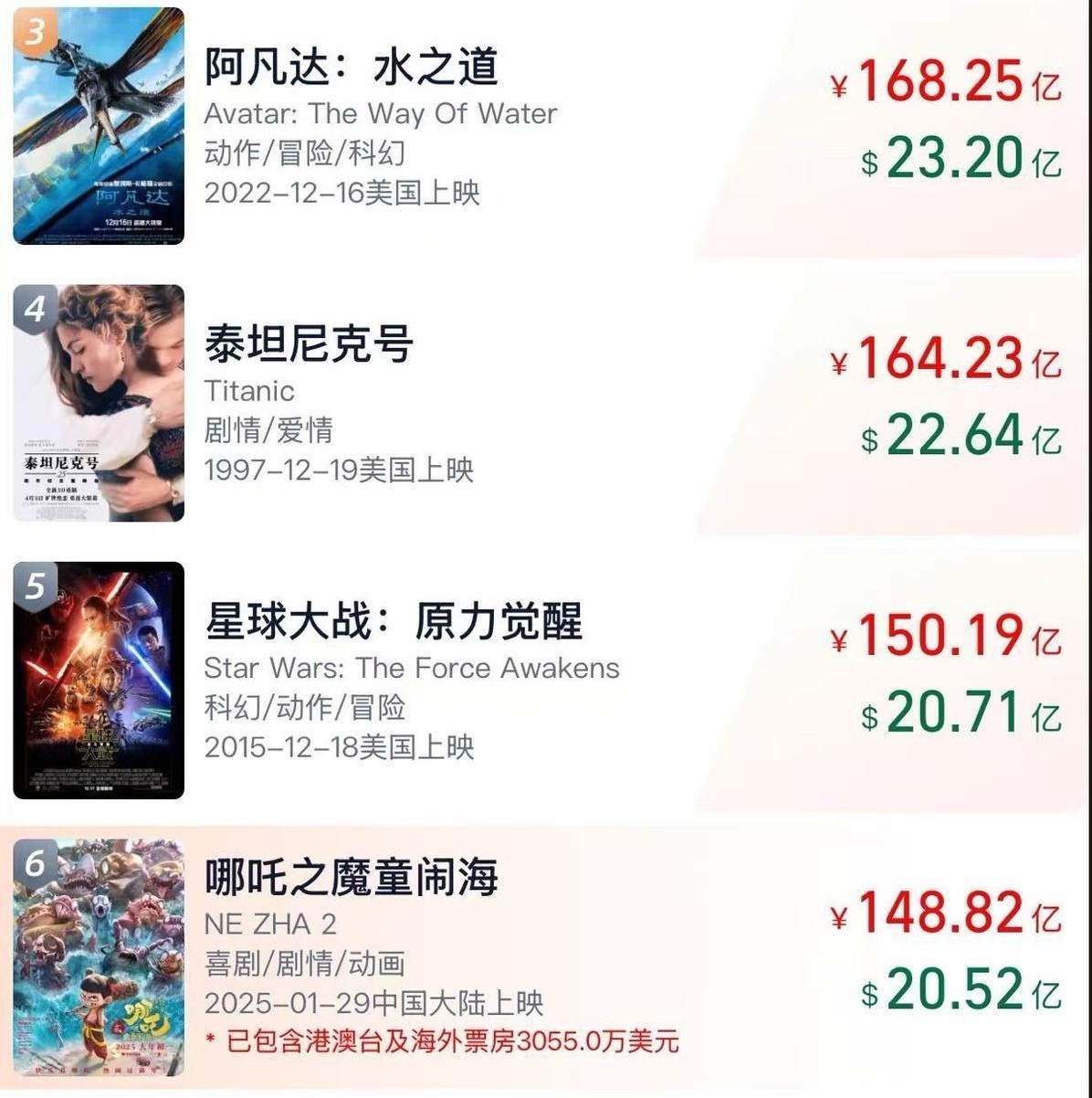 这意味着,《哪吒2》进一步特等《星战7》,踏进全球TOP5,实在是一件板上钉钉的事情了。