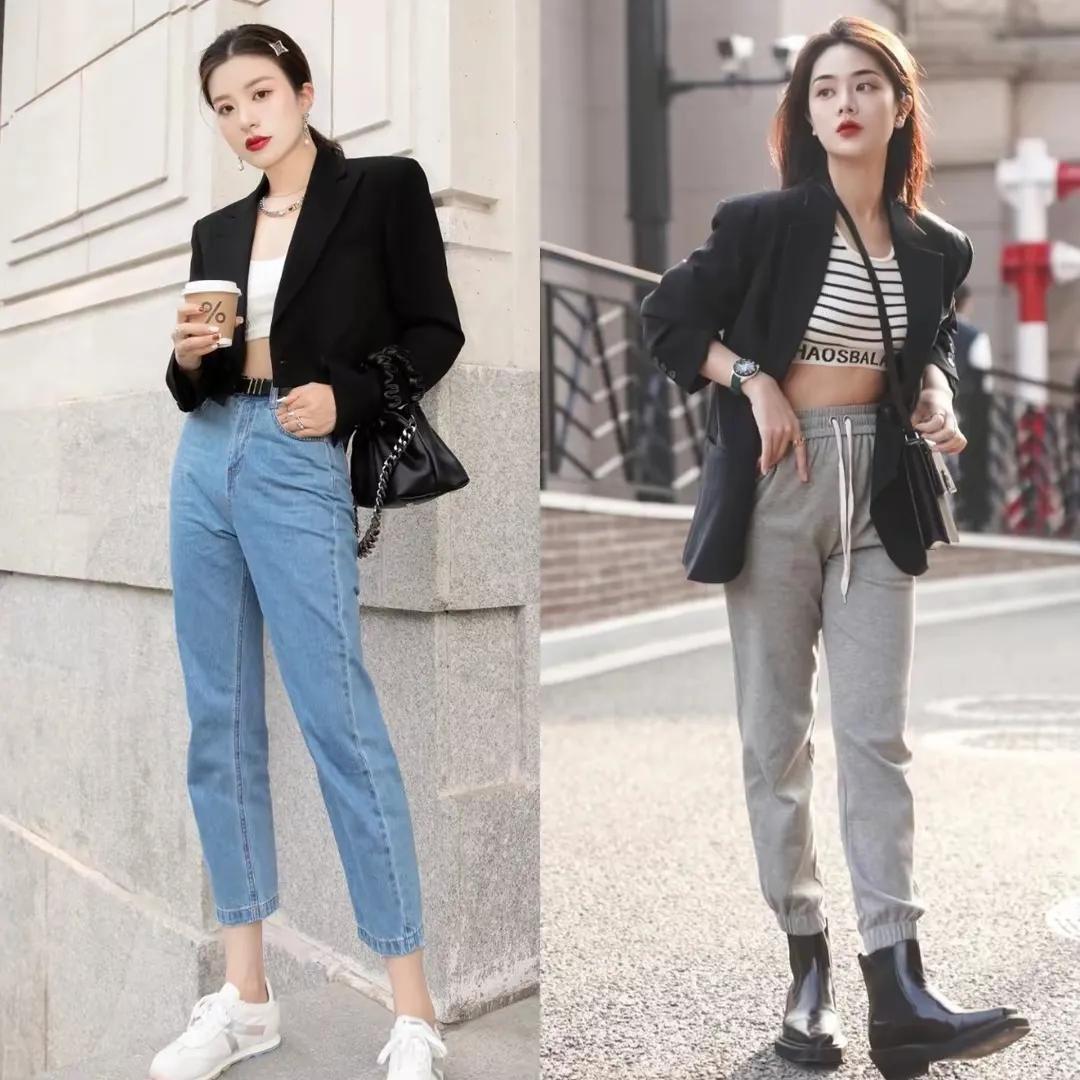 若是你是梨形身体,胯宽腿粗的情况下,又思要穿出修长平直的好意思腿,我个东谈主还蛮推选遴选烟管裤来搭配的,十分像底下左边的这一套穿搭,用短款的玄色西服外衣搭配上蓝色的烟管九分牛仔裤,脚上踩了一对平底的通顺鞋,这独处穿衣造型还摄取了上短下长的搭配手段,使得穿搭者的身体比例变成三七分,这么的穿搭太符合小个子女生鉴戒了。