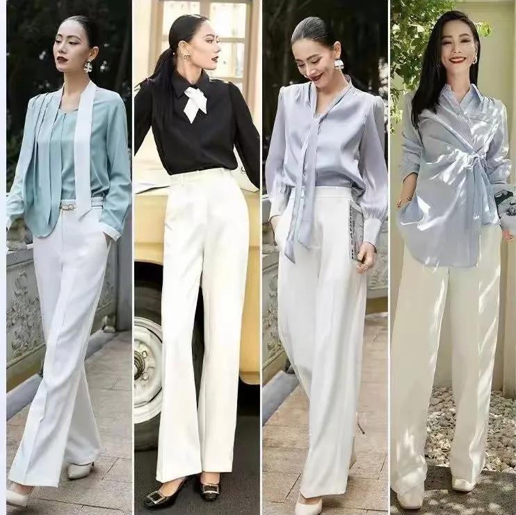 举例底下这四套穿搭,用不齐心绪的衬衫搭配上白色的阔腿西裤,脚踩双前后的高跟单鞋,轻狂妄松穿出女神范。
