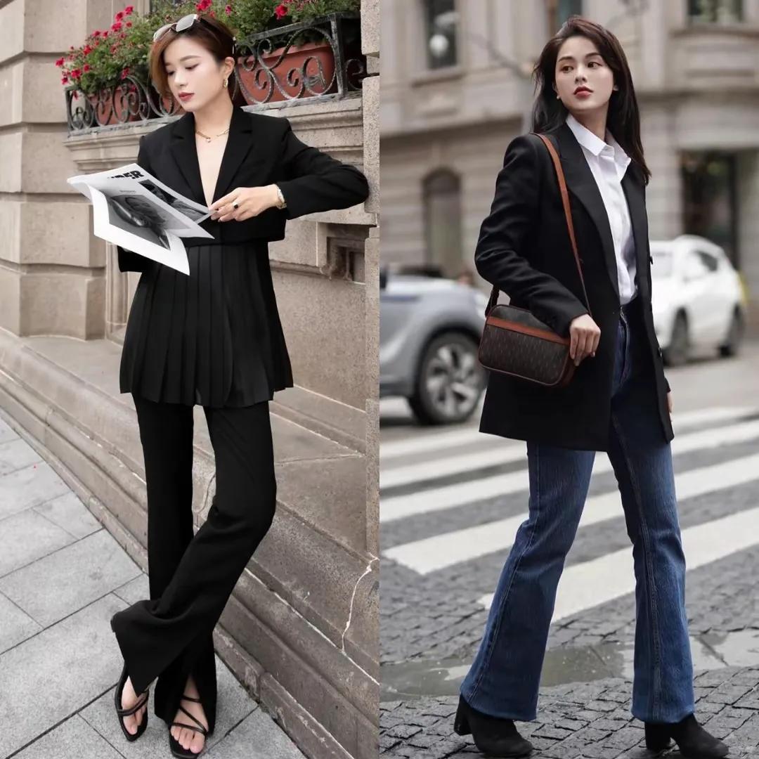 职场女性思让我方的穿衣造型比拟干练,何况又不会过于寂寞,提倡全国尝试底下右边的这一套穿法,一件玄色的西服,内搭白色的衬衫,加上电身就领有前锋元素的微喇叭牛仔裤加彩,一对玄色的粗跟短靴,从穿衣配色上来说,不错符合大部分强横行家女性,基本上不挑东谈主,不挑肤色,谁穿谁排场,何况西服和衬衫齐是比拟挺阔有型的衣着,面料比拟遮肉,加上天生就领有前锋元素的微喇叭牛仔裤,不错说是如何穿齐排场。