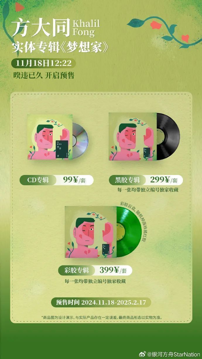 方大同终末一张专辑《梦念念家》于客岁11月18日至2月17日在网店星河方舟开启预售,预售时辰浪费者有契机立地取得方大同亲笔签名照,首批购买专辑的浪费者已持续收成。实体专辑共分为三种类型,CD专辑每套售价99元,黑胶专辑每套299元,彩胶专辑每套399元,其中黑胶专辑和彩胶专辑每一张皆带有落寞编号独家储藏,彩胶专辑以盲盒形貌发售,内含有绿胶、红胶两种热沈,浪费者立地取得其中一种热沈,其中红胶的数目相对比拟罕有。