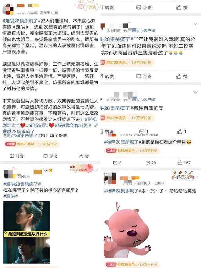 恰是因为这样,开播前被吹上天的《难哄》才会高开低走,堕入无东说念主防卫的僵局。眼看着剧集将近播到末尾了,3月10日对于“《难哄》28集杀疯了”的话题登上热搜。这集具体讲的是男主桑延亲手收拢了车兴德,却被刺伤缝了针。女主温以凡得知男主桑延受伤后悼念恸哭。这段在原书里属于名局势,剧集收复又加了些刺激的打斗戏份和娇弱女主落空感拉满的哭戏,当然会引起部分网友的共情。
