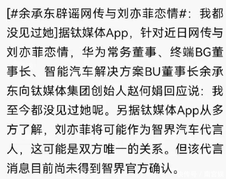 诚然台媒所说起的“恋情”莫得任何实锤,但刘亦菲和余承东在网上有互动如实属实。