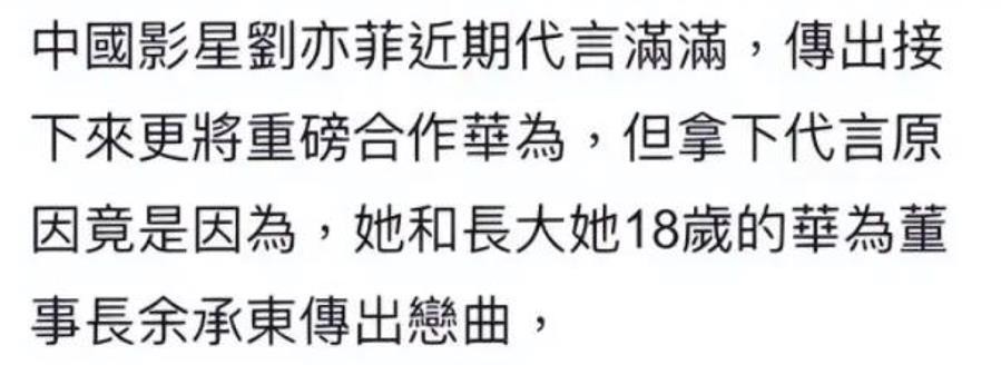 台媒在爆料中指出,刘亦菲如今有好多代言,接下来还要与华为融合,而之是以会获取这个契机,是因为刘亦菲和大18岁的余承东传出恋曲。