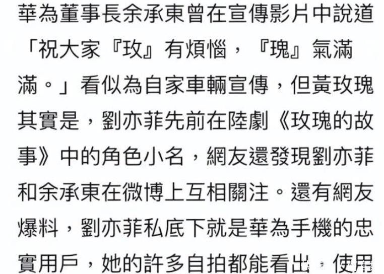 况兼余承东和刘亦菲之间还有互动,两东谈主是在微博上还是互关,此外,刘亦菲还被网友扒出,她一直是华为手机的至意用户。