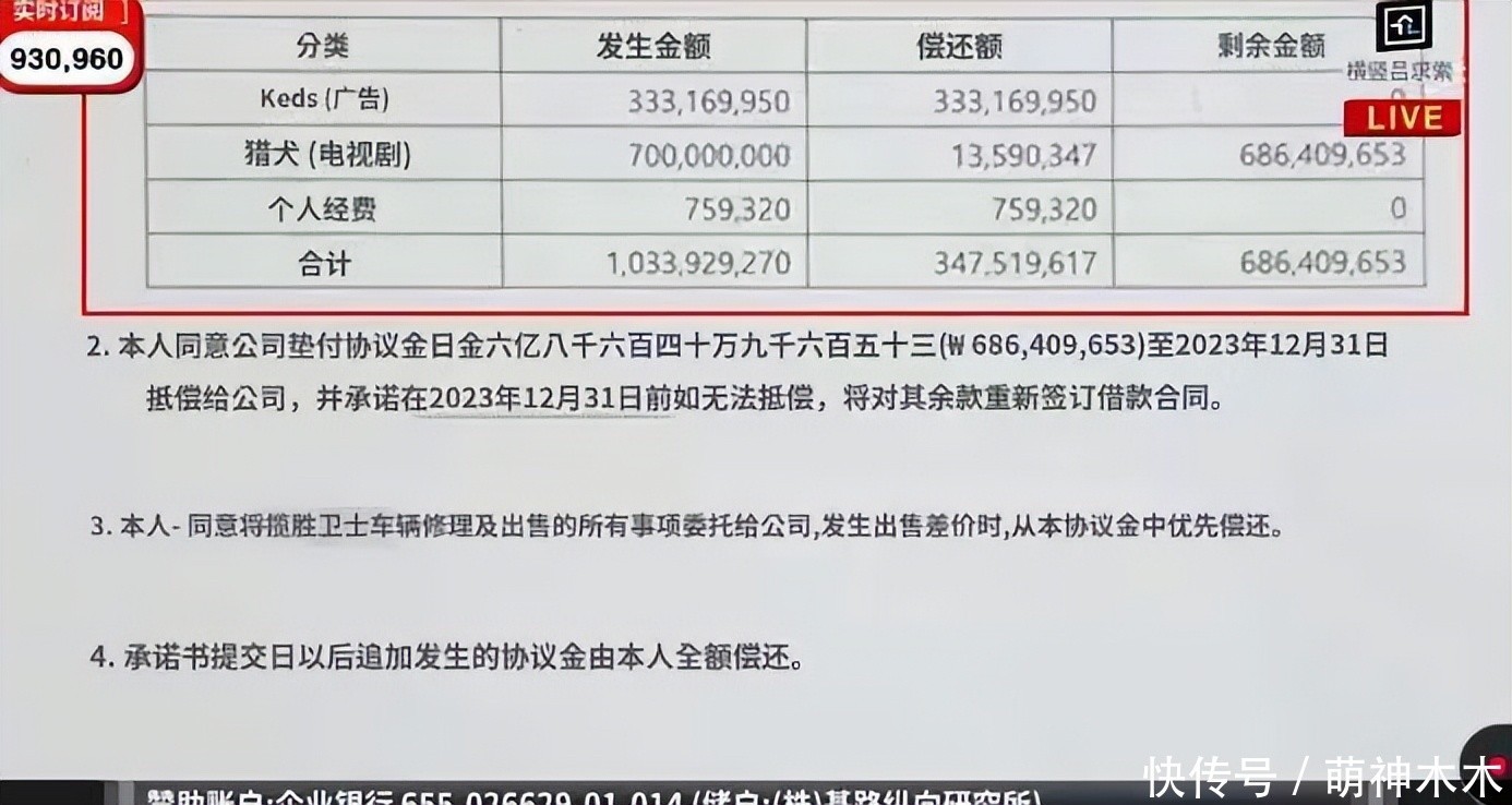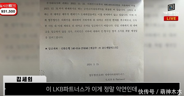 韩媒还曝光了金秀贤公司方面发给金赛纶索债的告示和债务清单,包括了电视剧补偿、告白等,6.8亿韩元。
