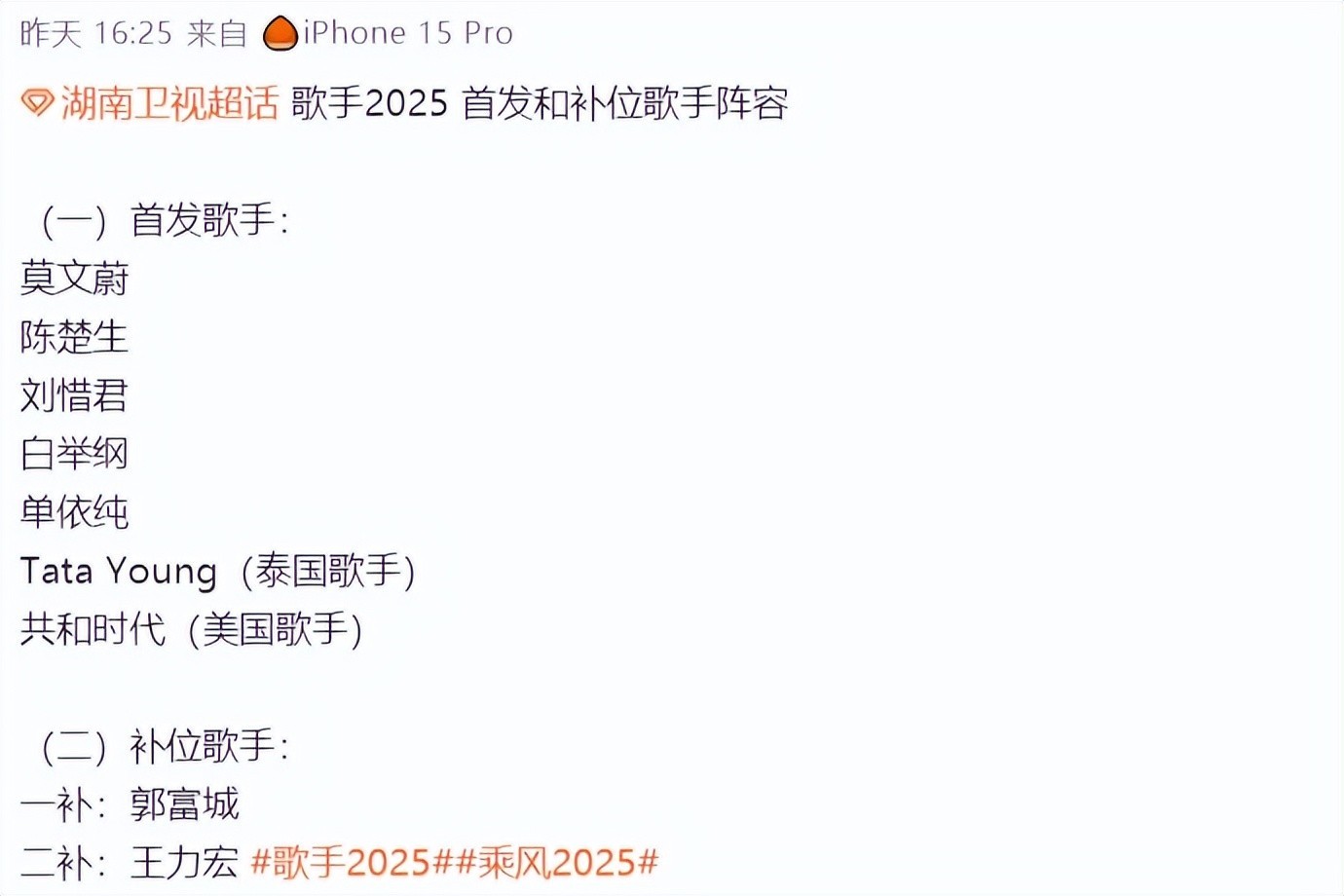《歌手2025》共官宣两位歌手,一位是首发歌手陈楚生,另一位是《下一战歌手》告捷的白举纲,其余的歌手全部待定,当网传的名单引起浓烈规画的技能,网上又传出一份名单,在这份名单中,除了陈楚生和白举纲外,咱们还不错一看到:莫文蔚、刘惜君、单依纯、Tata Young、OneRepublic。
