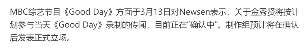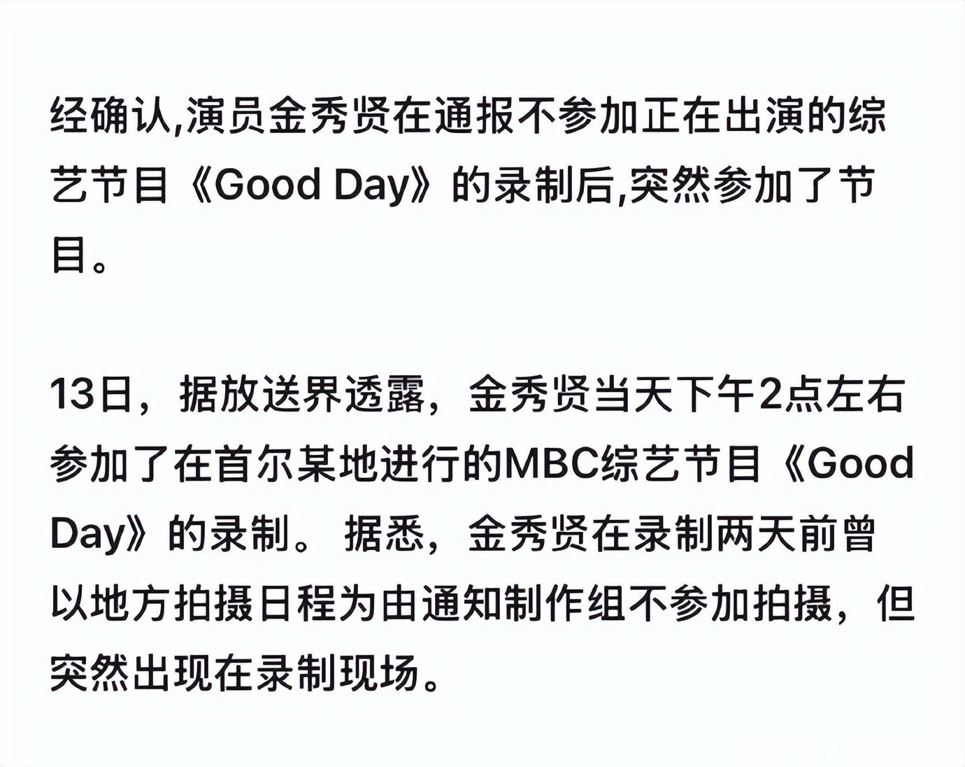 随后,节目组经由阐明,露出金秀贤一忽儿插足了节目。据悉,金秀贤在录制两天前曾以场地拍摄日程为由见知制作组不插足拍摄,但13日下昼2点傍边,一忽儿出现时录制现场。