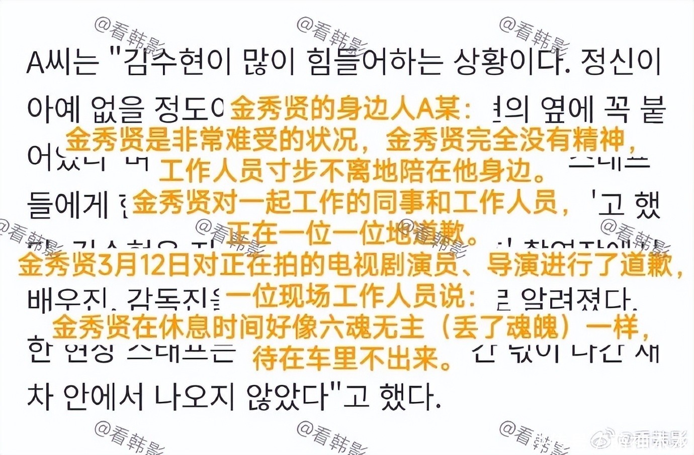 与此同期,对于金秀贤崩溃的新闻也出来了。身边东谈主披露他现象欠安,休息的时候像丢了魂,打不起精神,长时间待在车里不出来,况且跟同组的职责主谈主员挨个谈歉。这短短几句话槽点颇多,不啻有帮金秀贤卖惨嫌疑,还费解默示相助方力挺以及金秀贤敬业,唯有休息时孤独。