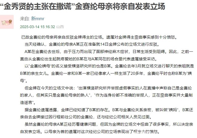 “横竖研”还示意,将公开金赛纶母亲切身写的态度文。此前金秀贤公司质疑“横竖社”邀请的举报东说念主所谓赛纶的“姨母”身份不解,凭几张像片就扭曲事实,制降低言。而履行上,这位“姨母”和赛纶姆妈沿途糊口了30年,此前赛纶借手机的表姐就是这位姨母的犬子。而这一次,金赛纶母亲将不顾健康问题,将切身发表态度,刺破金秀贤的坏话。
