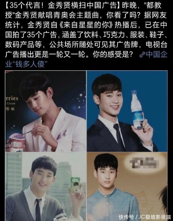 不仅在韩国,金秀贤在中国的粉丝也繁密,曾因《来自星星的你》火爆天下,14年在中国拿下35个代言,直到目下仍和部分中国商家有合营。这些年金秀贤在中国赚得盆满钵满。