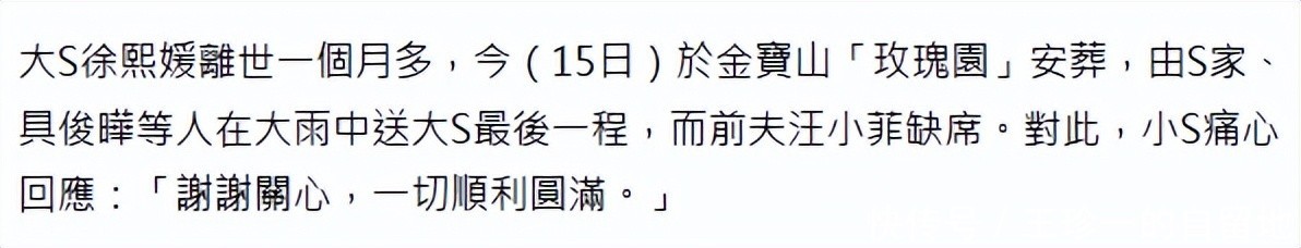 在大S骨灰埋葬之后,小S也第一本领陈说了姐姐安葬之事,她说“谢谢存眷,一切成功圆满”。