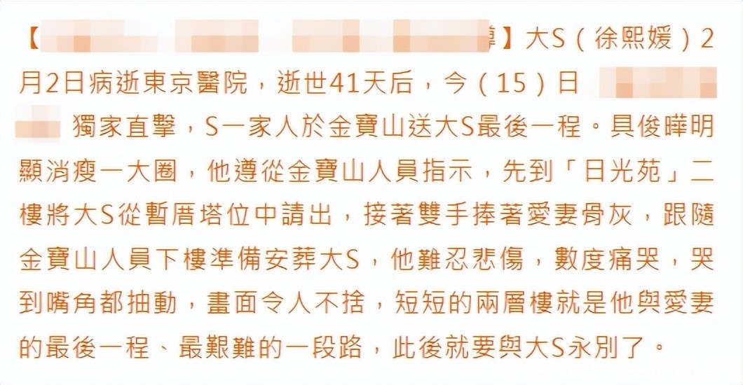 3月15日上昼,在离世41天后,大S的骨灰终于安葬了。