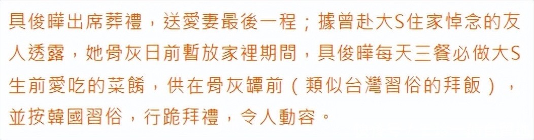 值得一提的是,台媒还报说念称,大S的骨灰放手在家中时,具俊晔每天三餐齐会作念大S爱吃的食品,供奉在大S的骨灰坛前,况且他还按照韩国的习俗膜拜。