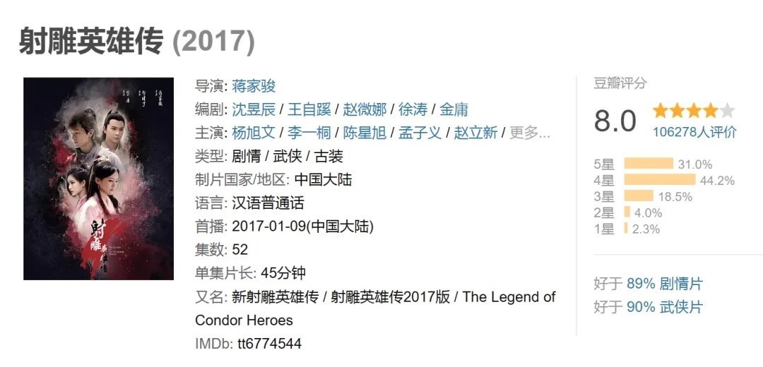 这些年,好一些的翻拍剧也有,比如电影《误杀》等等。2017版《射雕英豪传》被评价忠于原著,豆瓣评分达到了8分,不雅众相比招供。