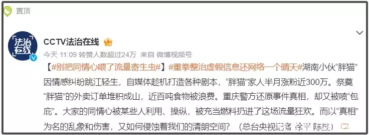——CCTV法治在线节目以“别把悯恻心喂了流量寄生虫”话题开篇,提到了胖猫事件中有自媒体顺便打造脚本,“胖猫”家东说念主半月涨粉近300万,指出某些东说念主哄骗、支配了全球的悯恻心。