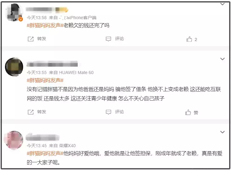 另外,还有网友想起胖猫一家东说念主也曾卷入老赖争议,胖猫亦然因为家东说念主才背上反璧务,一朝银行卡里有了钱,就会被划走还债,导致他手头莫得太多钱复旧糊口,才推敲把钱转给女友谭竹。