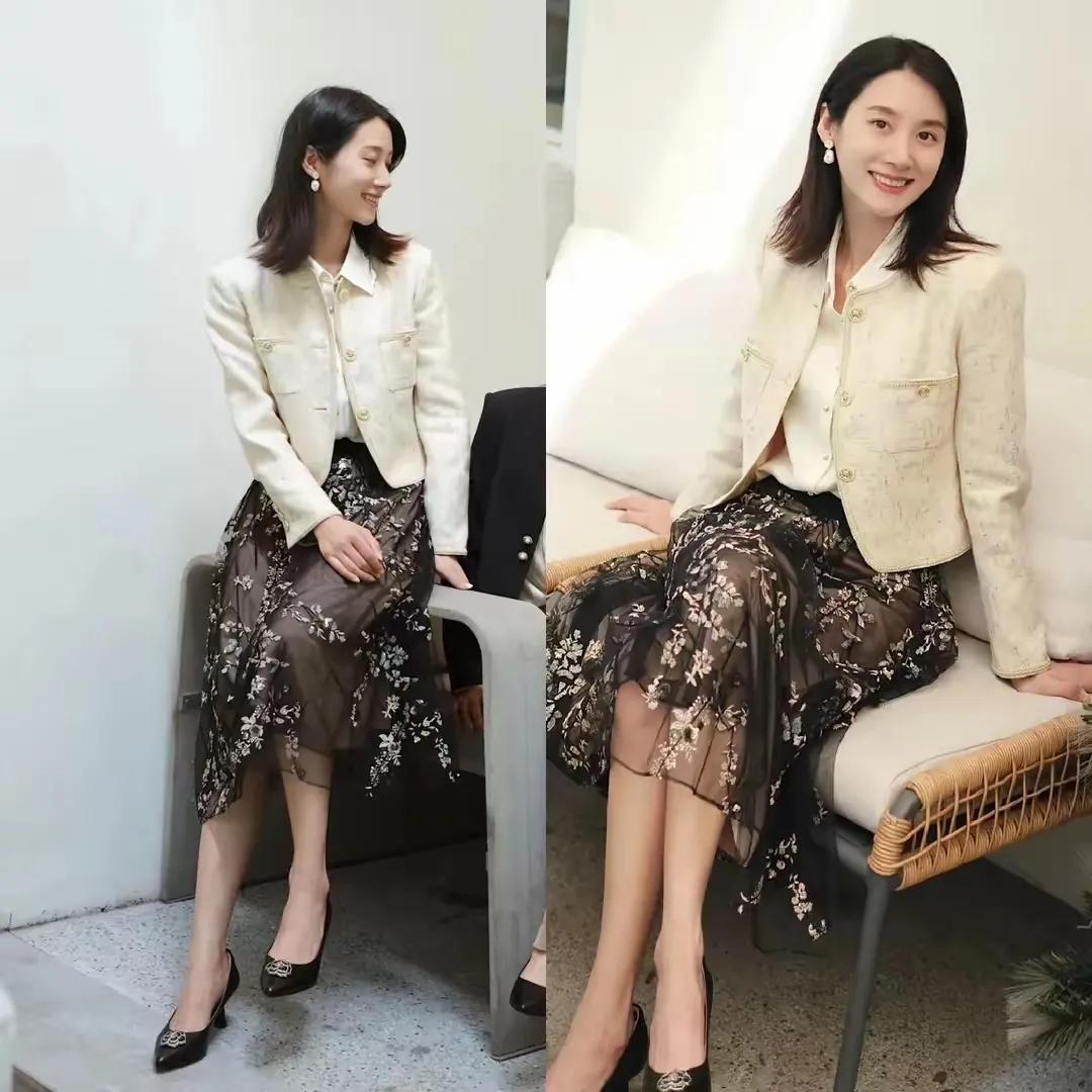 不同的裙子面料打扮出来的成果也有很大的区别,比如说底下这一套穿衣打扮用小香风外衣内搭一件衬衫,下半身是用印花薄纱款式的半身裙来搭配,脚踩双浅口的单鞋,这么的穿衣打扮有一种纯属感,不外也很顺应咫尺的春季。