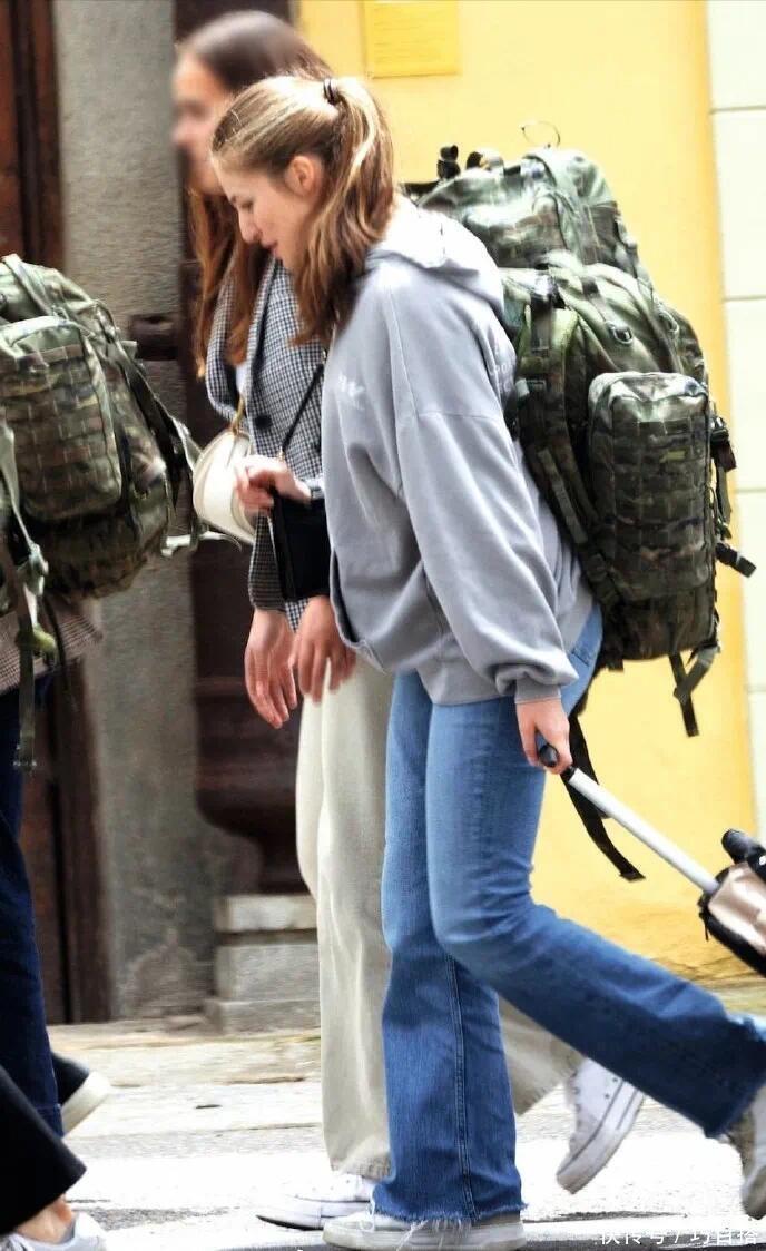 在完了新一轮检修后,莱昂诺尔公主遴荐和同学沿途去国内旅游,镜头中的她完全等于深广学生的阵势,选择灰色连帽卫衣与因循蓝拖地牛仔裤搭配,特殊接地气。