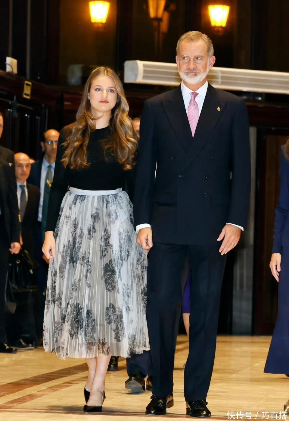 和父亲同框入镜的莱昂诺尔,气场完全收受了她的父亲,一件玄色紧身打底衫搭配一条高腰百褶碎花裙,肤浅利索又有女东谈主味。