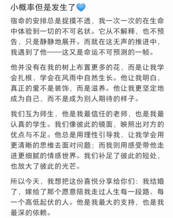 向全宇宙晓示喜信晓示喜信的长文当中,Bella直言这齐是宿命最佳的安排,恰是因为碰见了现任,她才能得以成长为更好的我方,并直言说我方与丈夫的干系,更像憨厚与学生。