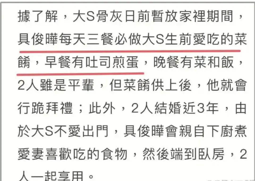 凭证媒体的报说念,具俊晔在大S牺牲之后,每天齐在豪宅内部,仍是按照以往的生存模式,每天齐给老婆作念心爱的饭菜。