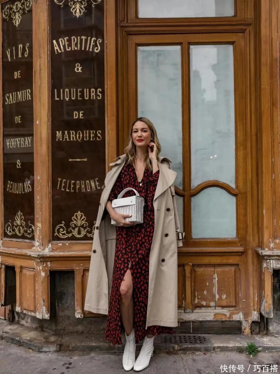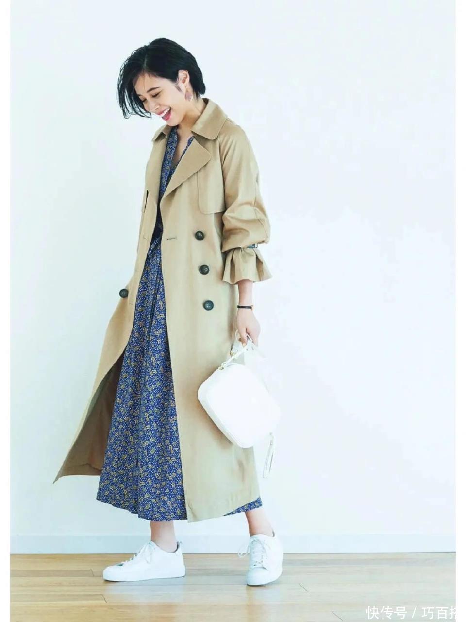 风衣搭配碎花裙不错展示完全细密的通勤优雅作风,卡其色风衣搭配深色碎花裙脚踩白色板鞋,温雅又精粹。