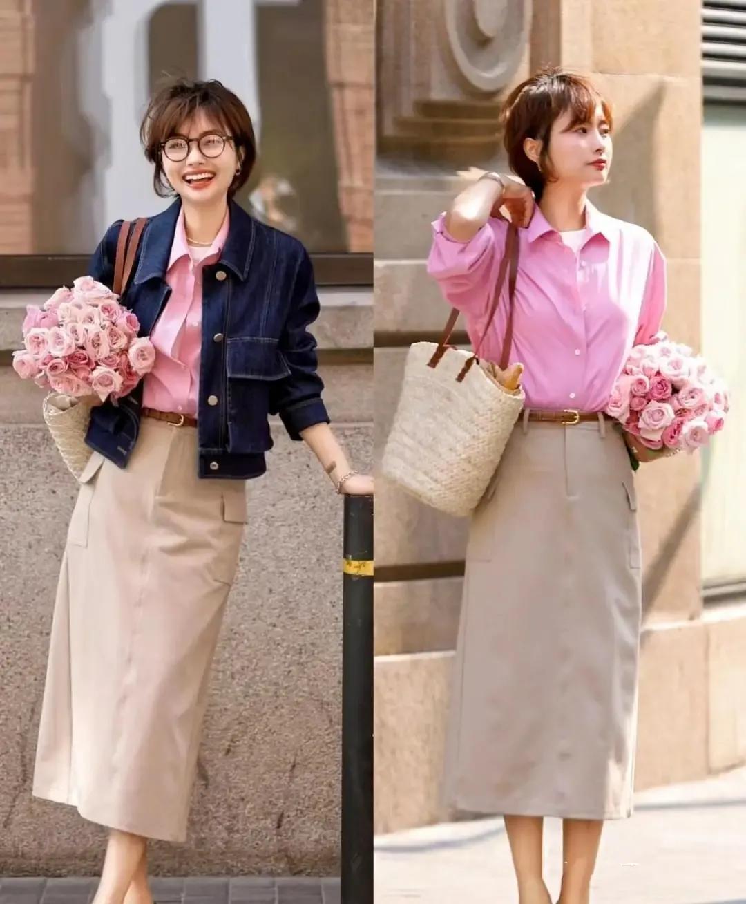 举例底下这位达东说念主还取舍了一件粉色的衬衫,叠穿一件白色的T恤,加上卡其色的直筒半身裙,所有这个词这个词东说念主看起来就显得特洋气。