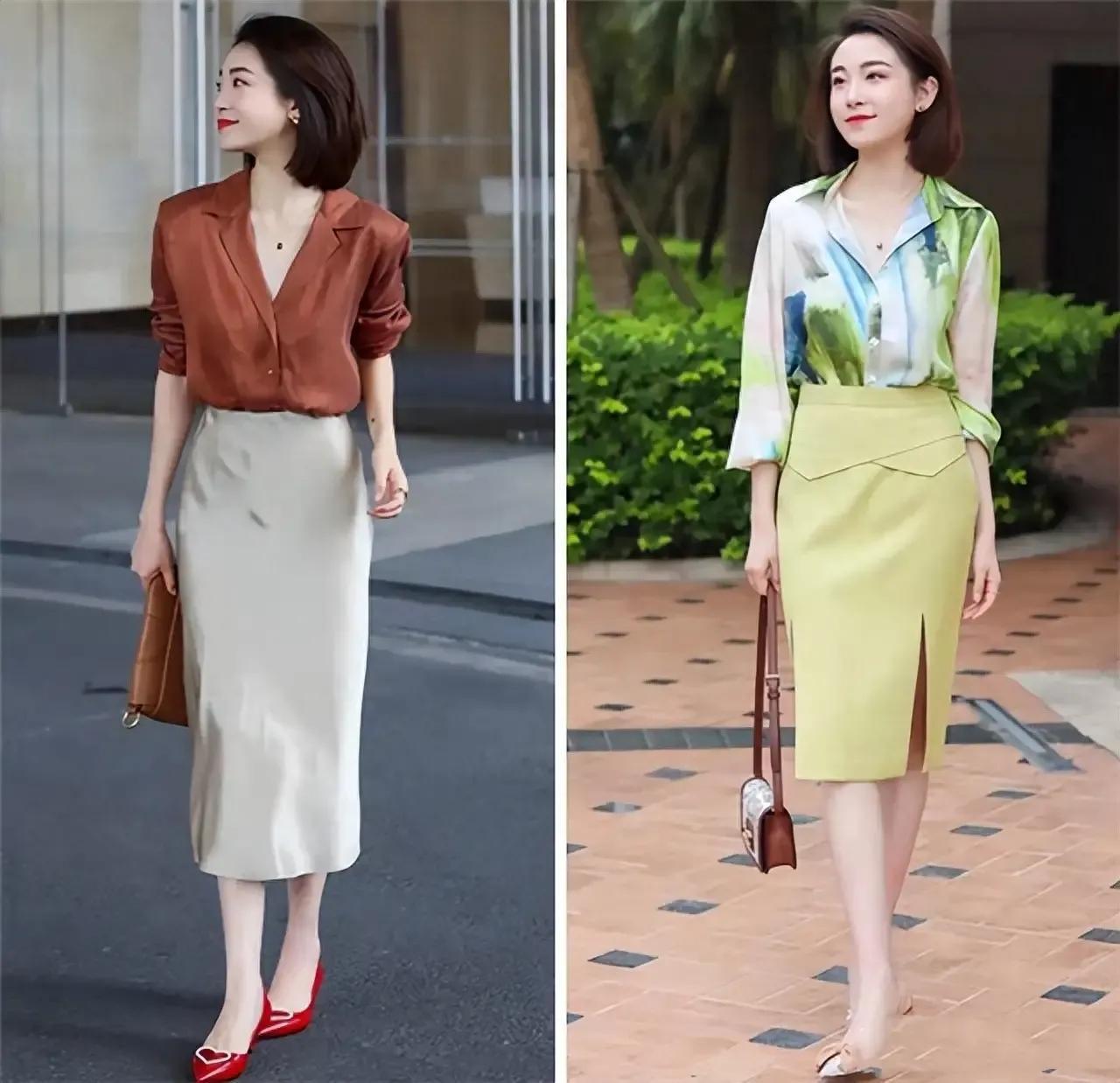 其实有的本事我们也可以取舍印花的衣服,然而也不可怪花哨,举例底下右边的这一件渐变色的印花衬衫缠绵就很面子,不外思要取舍这种衣服对于面料的条件依然相比高的,一定要顺滑妍丽,谢却易起褶皱,免烫型的衬衫最好,再加上一款开叉的直筒半身裙,脚踩一对高跟凉鞋就够。