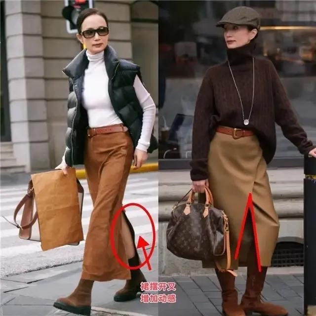 要是思要整套穿衣打扮相比个性的情况下,可以像底下这位达东说念主一样,用咖色的真挚毛衣搭配上卡其色的开叉半身裙,脚踩一对中筒靴,头上还可以加上一款帽子,片刻所有这个词这个词造型就更面子。