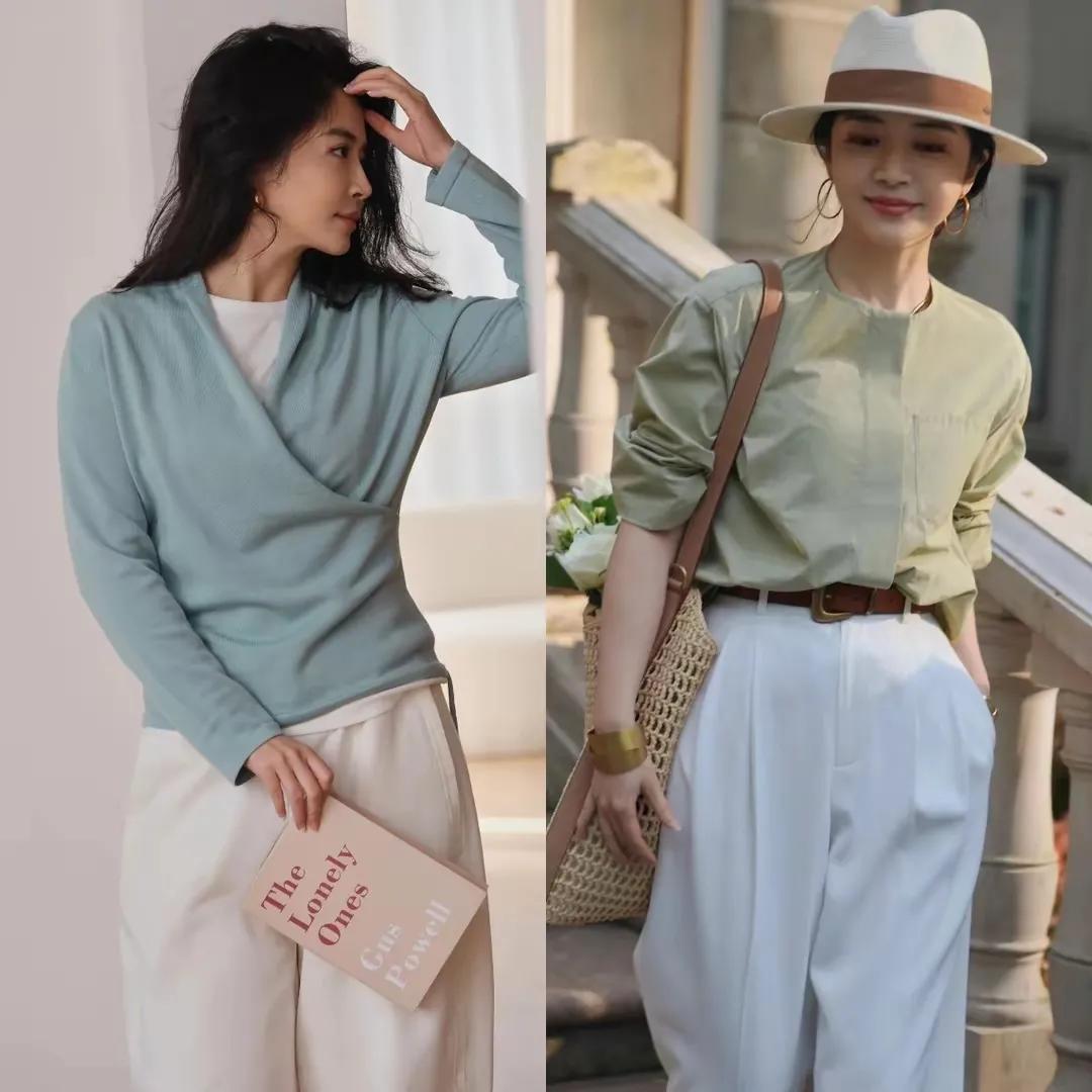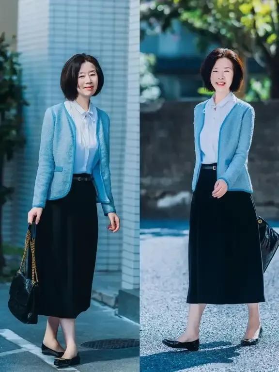 要是思让我方的穿衣打扮相比亮眼的情况下,如实也可以取舍彩色,不外千万不要选那种大红色,大紫色的衣服,用淡色系的衣服单品来搭配基础色最好,举例底下间蓝色的小香风外衣,内搭白色的衬衫,加上最为基础的玄色直筒半身裙,交叉一对玄色的乐福鞋,这么的穿衣造型最安妥中年女性了。