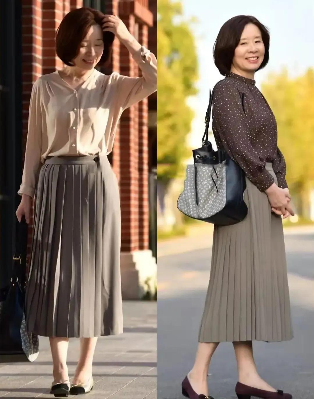思要变得愈加优雅多礼,无论你取舍是什么样的衣服,依然裙子,裤子皆尽量不要过于紧身,也不可过于宽松,比如底下这两套穿衣打扮,取舍的是衬衫上衣,版型缠绵,腰间的位置留多余量,不会过于紧身,恰好能把腰间的赘肉小肚腩遮住,下半身取舍到百褶半身裙亦然高腰收腰伞状的项目,这么的版型能把腿粗胯宽皆遮住。