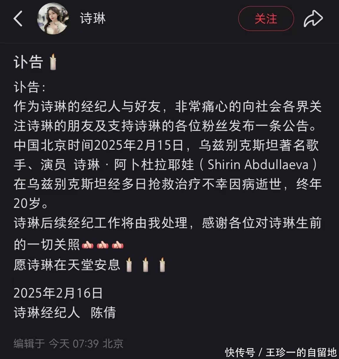 诗琳病逝的音讯由其牙东谈主在其账号上发布。