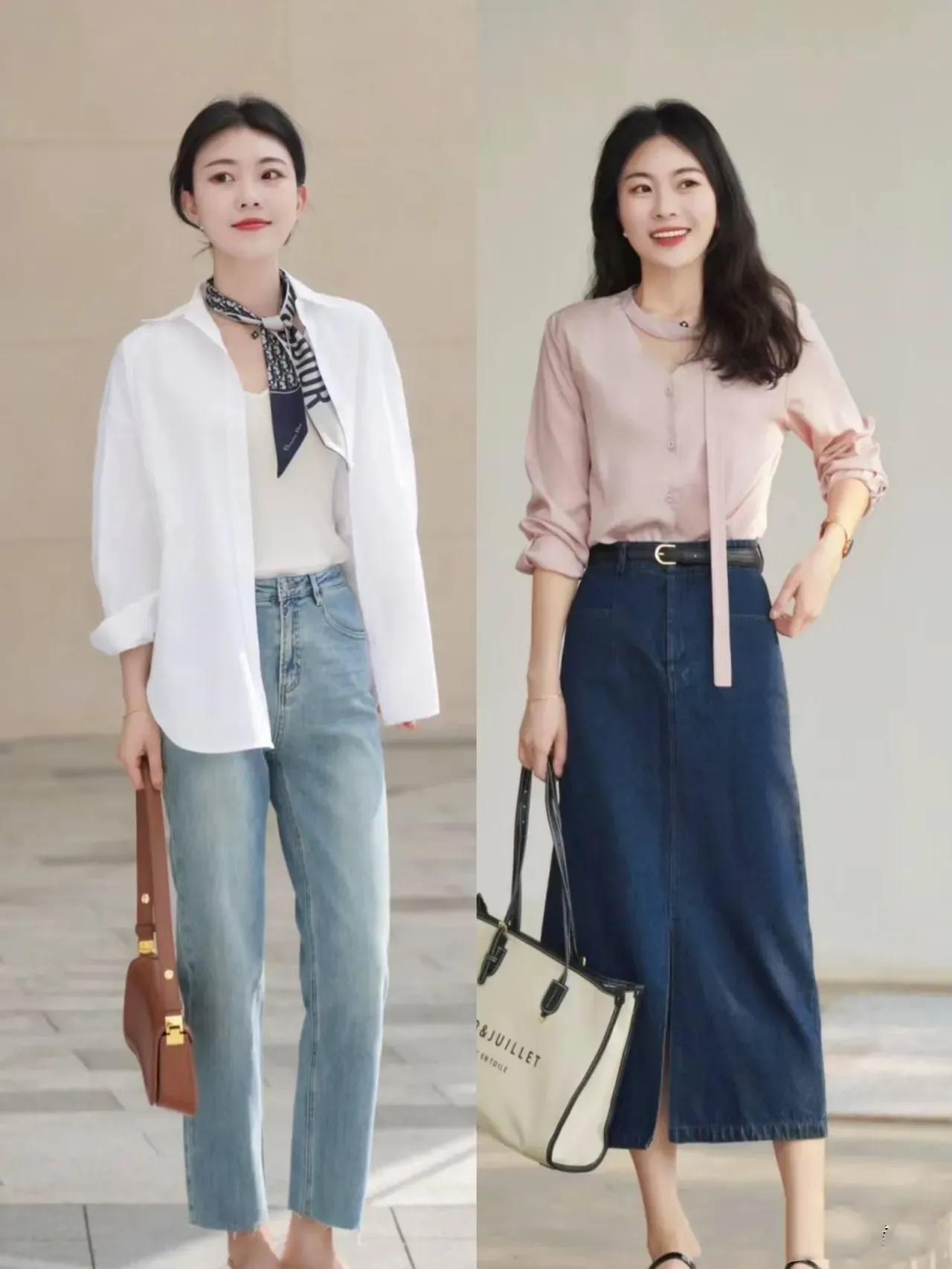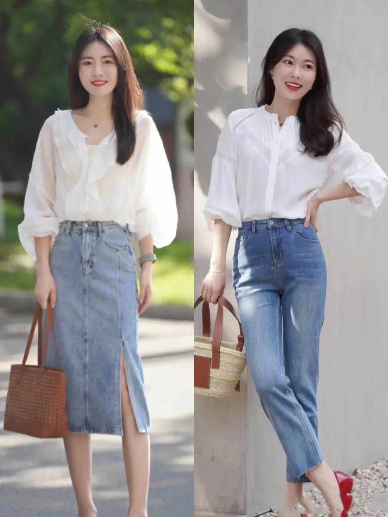 ①,白色衬衫搭配牛仔半身裙牛仔裤