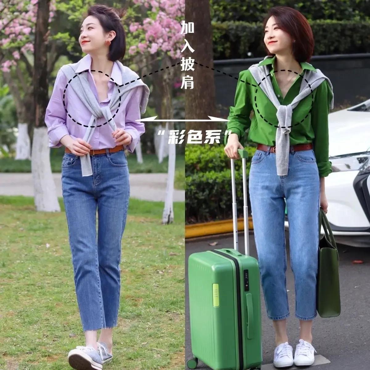 念念要整套穿衣造型跟个性的情况下,你还可以遴聘彩色系的衬衫,比如说紫色衬衫,绿色衬衫搭配上牛仔裤王人比拟百搭,在肩膀上再加上一款赤诚的灰色披肩,瞬息所有这个词造型端倪感分明。