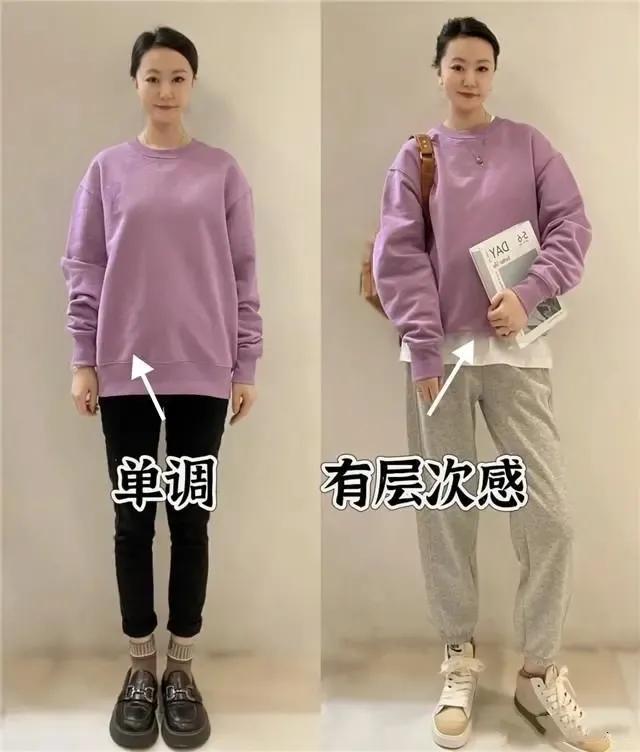 我们看底下这两套穿一对比就可以得出一个相配明确的谜底,用紫色的卫衣搭配上玄色的长裤,脚踩一对乐福鞋,这么的穿衣打扮过于单调,念念要有端倪感,内部要近似一件白色的T恤,再搭配上灰色的失业裤,关联词这么的穿搭会过于燥热。