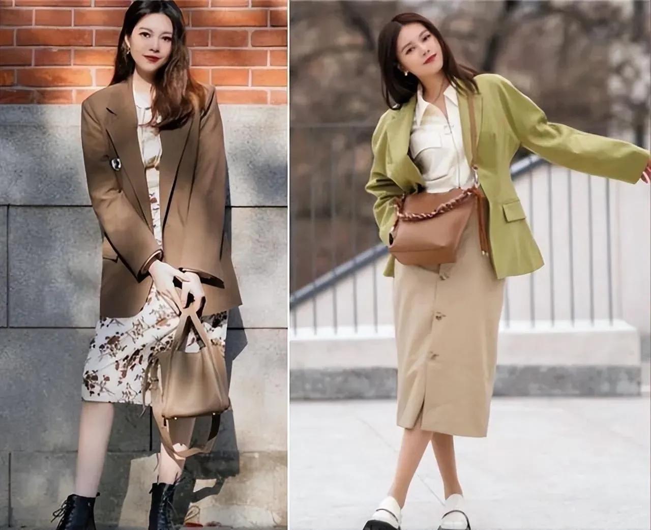 职场女性念念要惋惜文静,又念念要有优雅感的情况下,我们可以遴聘西服外衣搭配裙子,不外内部搭配的是连衣裙,就会变成外短内长的搭配,这么的穿衣造型很有端倪感,也比拟好穿搭。