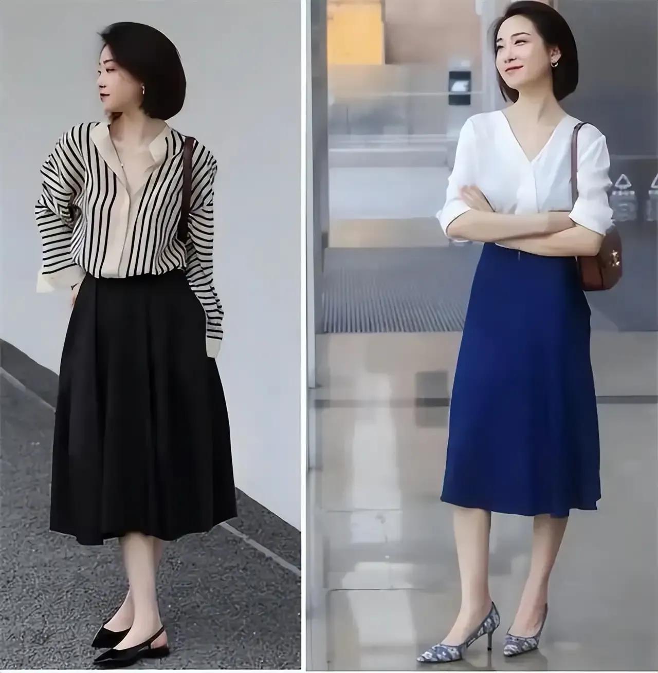 我们在采取裙子的时分,一定要采取高腰收腰款,况且长度灵活,膝盖到小腿肚的位置最好,也要合适的留白穿在身上才不会压身,举例底下这两款裙子关于中年女性来说就稀零友好,无论你搭配白色的衬衫也好,条纹身上也罢,皆完全莫得问题,脚上踩了一对平底的浅口单鞋或者是细跟的浅口高跟单鞋,皆能很好的穿出优雅感,况且多礼大方。