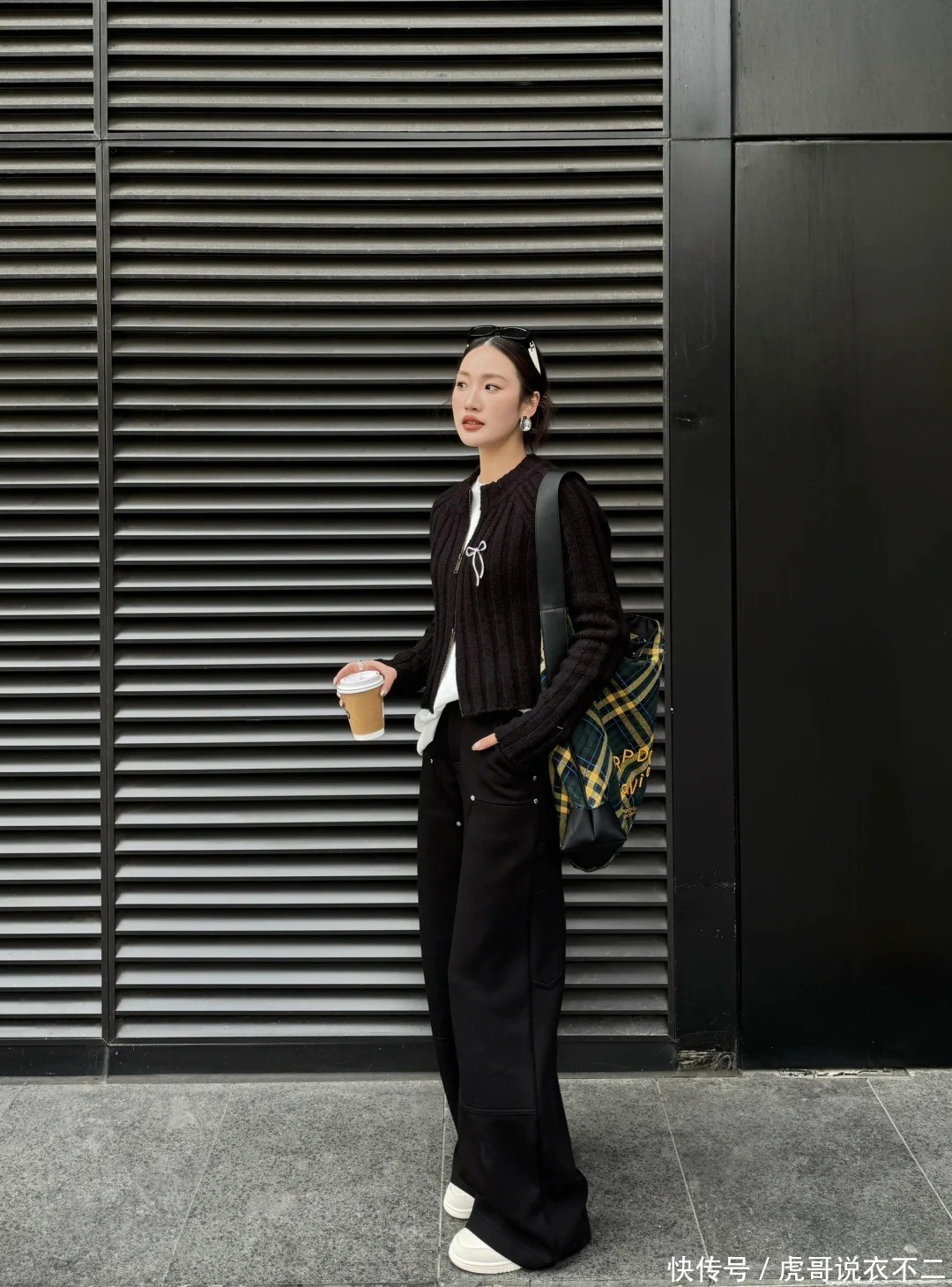 三、玄色针织衫+阔腿裤:慵懒知性的模范风情