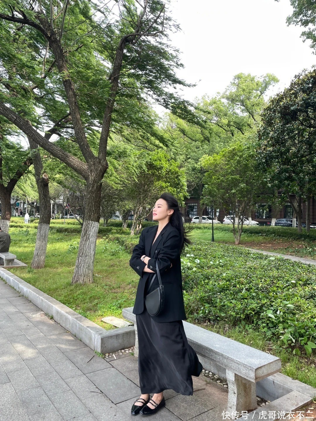 用真丝吊带裙的慵懒中庸西装的安详,领口处若有若无的锁骨线条成为最好配饰。外搭的西装忽视遴选oversize版型,袖口简洁挽起披露小臂,将"不好好穿衣"的前卫作风拿握得恰到平允,包包相通也保举玄色。
