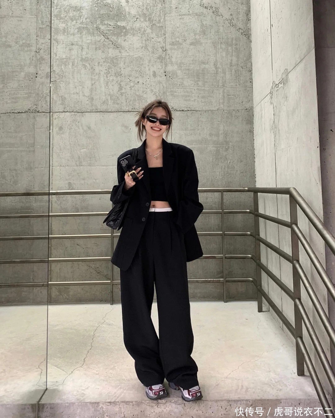 将传统西装穿出新意,要津在于内搭的巧想。玄色露脐背心与西装下摆变成"欲露还休"的档次感,高腰阔腿裤径直拉长下身比例,裤腰白边盘算推算的加入让全黑造型一刹有了呼吸感。